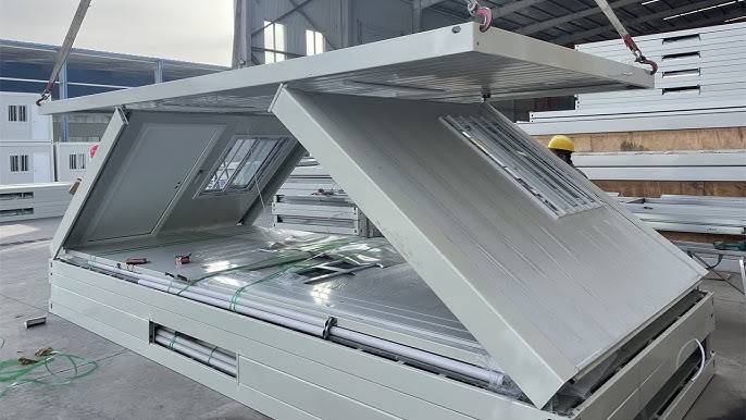 Para emergencias utilizamos otro tipo de módulos, son plegables. Estos módulos plegables tienen la particularidad de que se entregan preinstalados, incluyendo puertas y paredes. Los módulos se entregan plegados y se despliegan para su instalación en pocos minutos con la ayuda de una grúa.